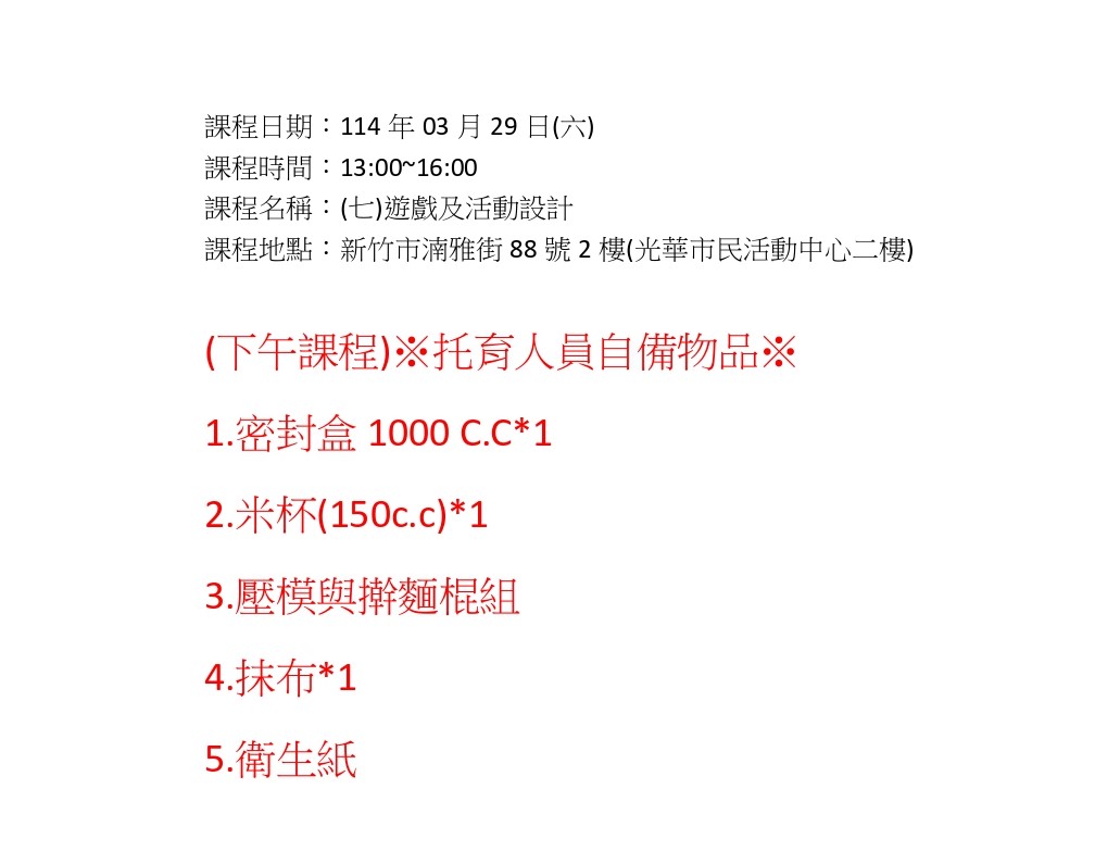 (下午課程)※托育人員自備物品※