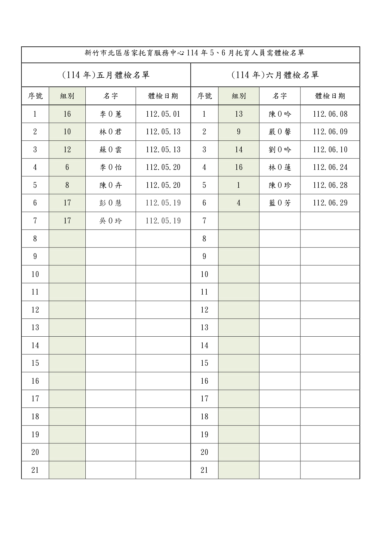 公告114年度5、6月須體檢托育人員名單