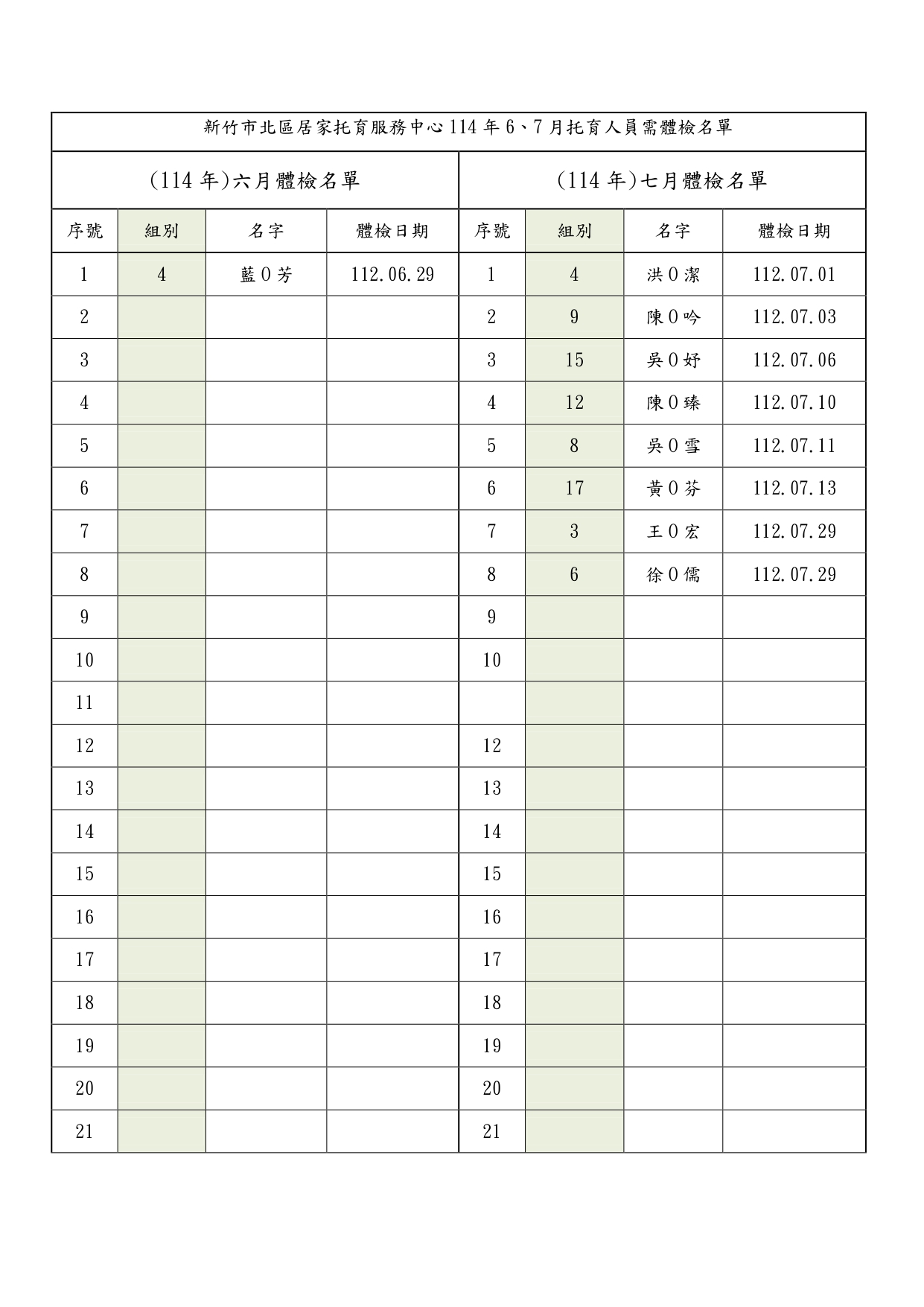 公告114年度6、7月須體檢托育人員名單