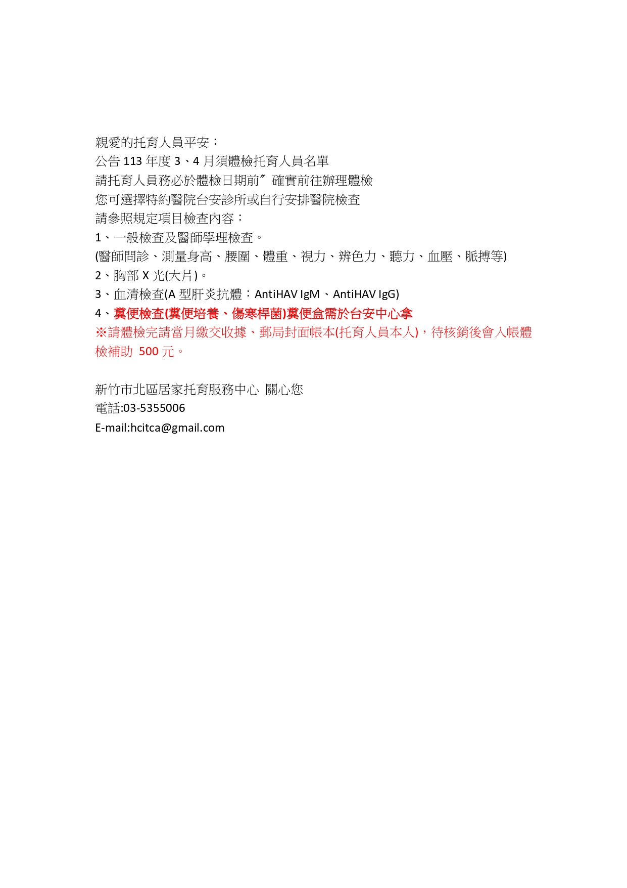 ※請體檢完請當月繳交收據、郵局封面帳本(托育人員本人),待核銷後會入帳體檢補助 500元。