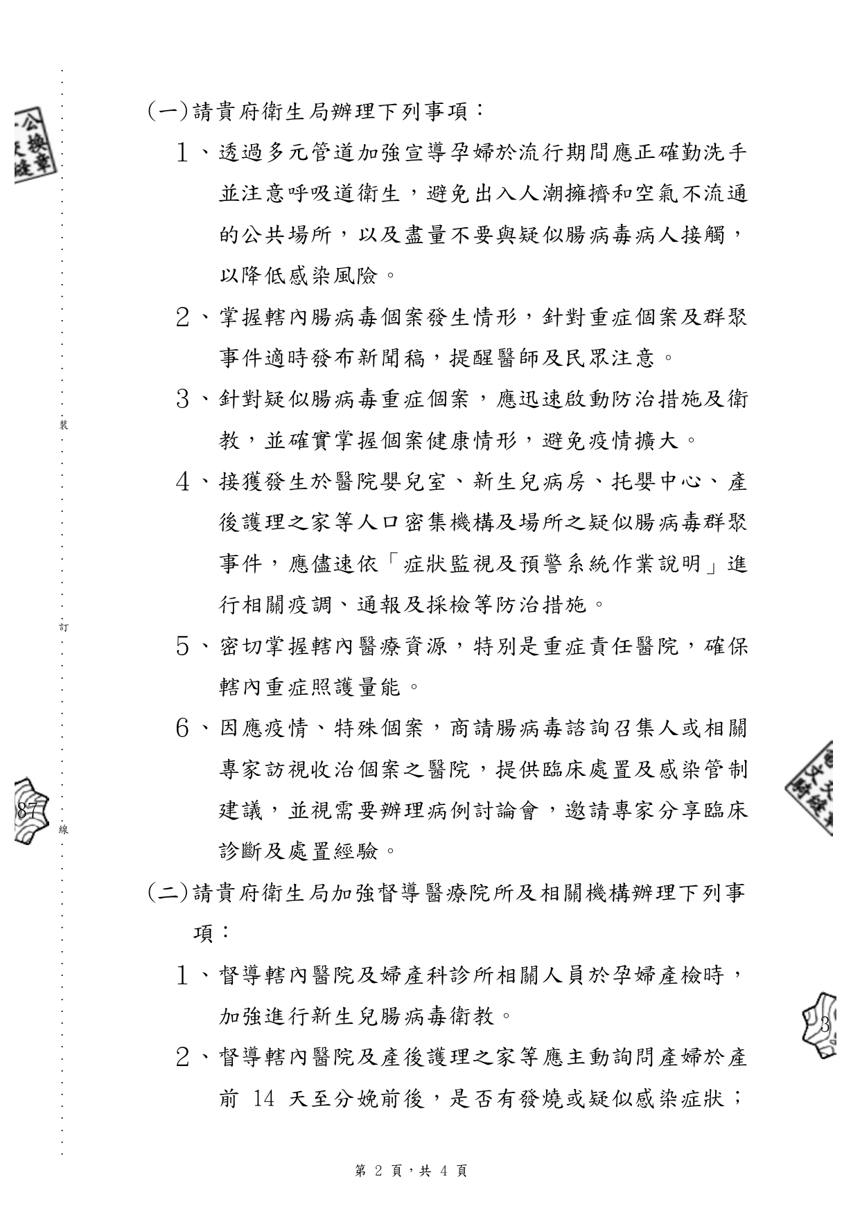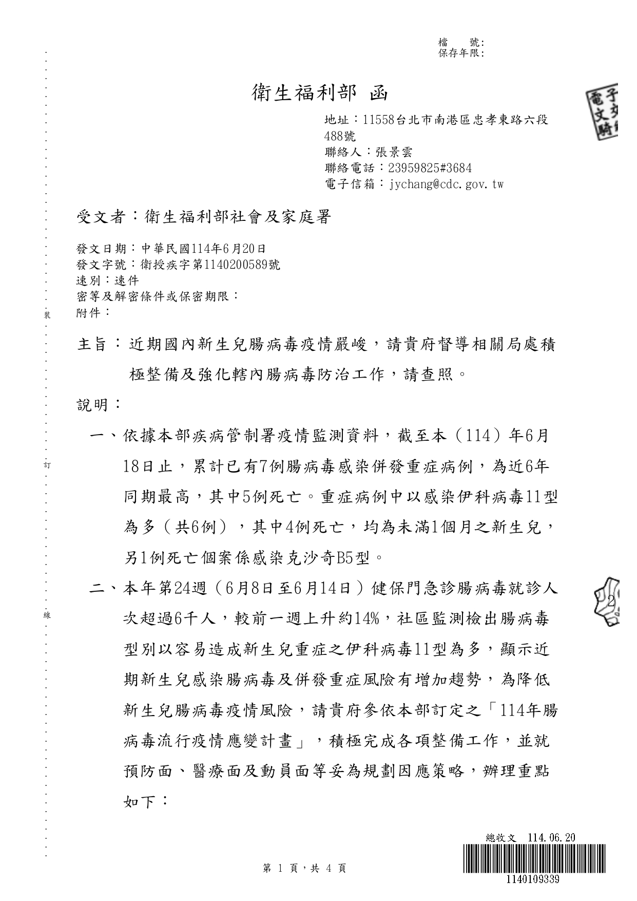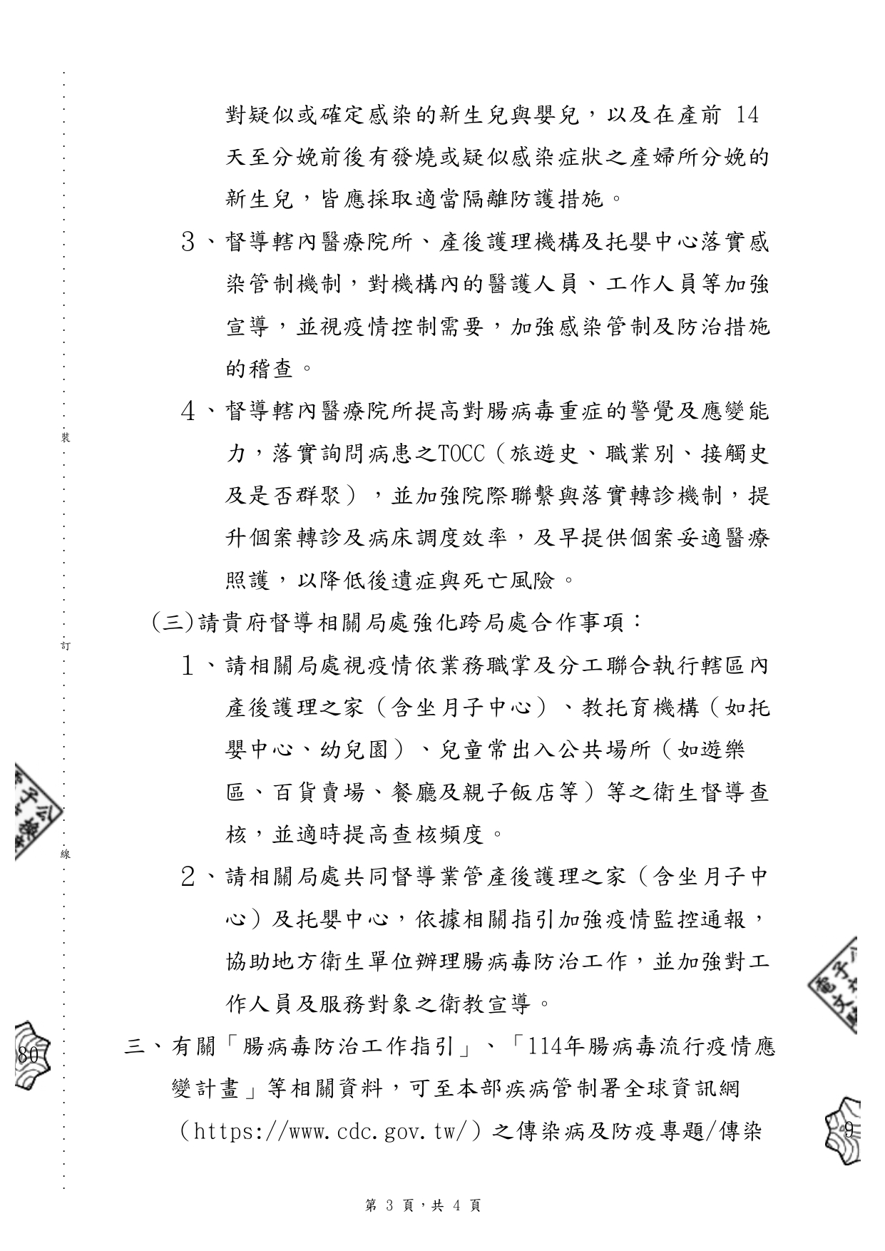 函轉衛服部及社家署之腸病毒資訊 近期處腸病毒高峰期,請托育人員留意居家環境之清潔及幼兒之健康,並可參考衛福部提供之腸病毒防治工作指引及114年腸病毒流行疫情應變計畫。 參考資訊如下:https://reurl.cc/Om7bz3