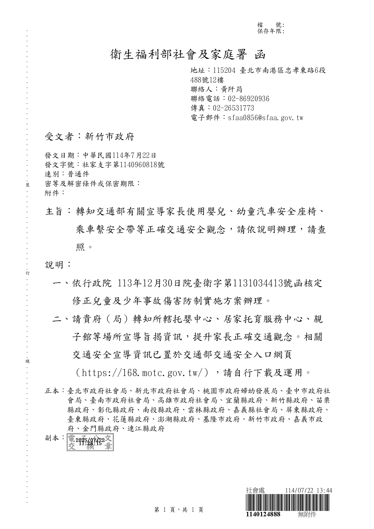 函轉衛服部及社家署之交通部 有關宣導家長使用嬰兒、幼童汽車安全座椅、乘車繫安全帶等正確交通安全觀念 轉知交通部有關宣導家長使用嬰兒、幼童汽車安全座椅、乘車繫安全帶等正確交通安全觀念 請轉知托育人員知悉。 參考資訊如下: