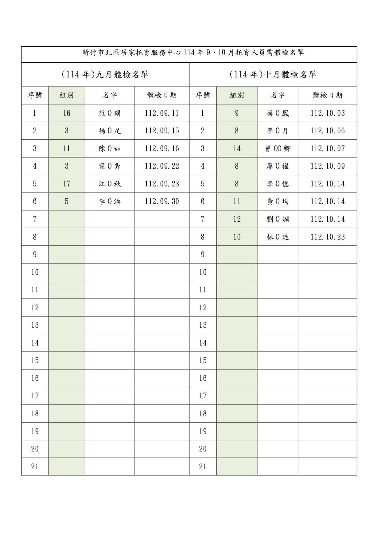 公告114年度9、10月須體檢托育人員名單