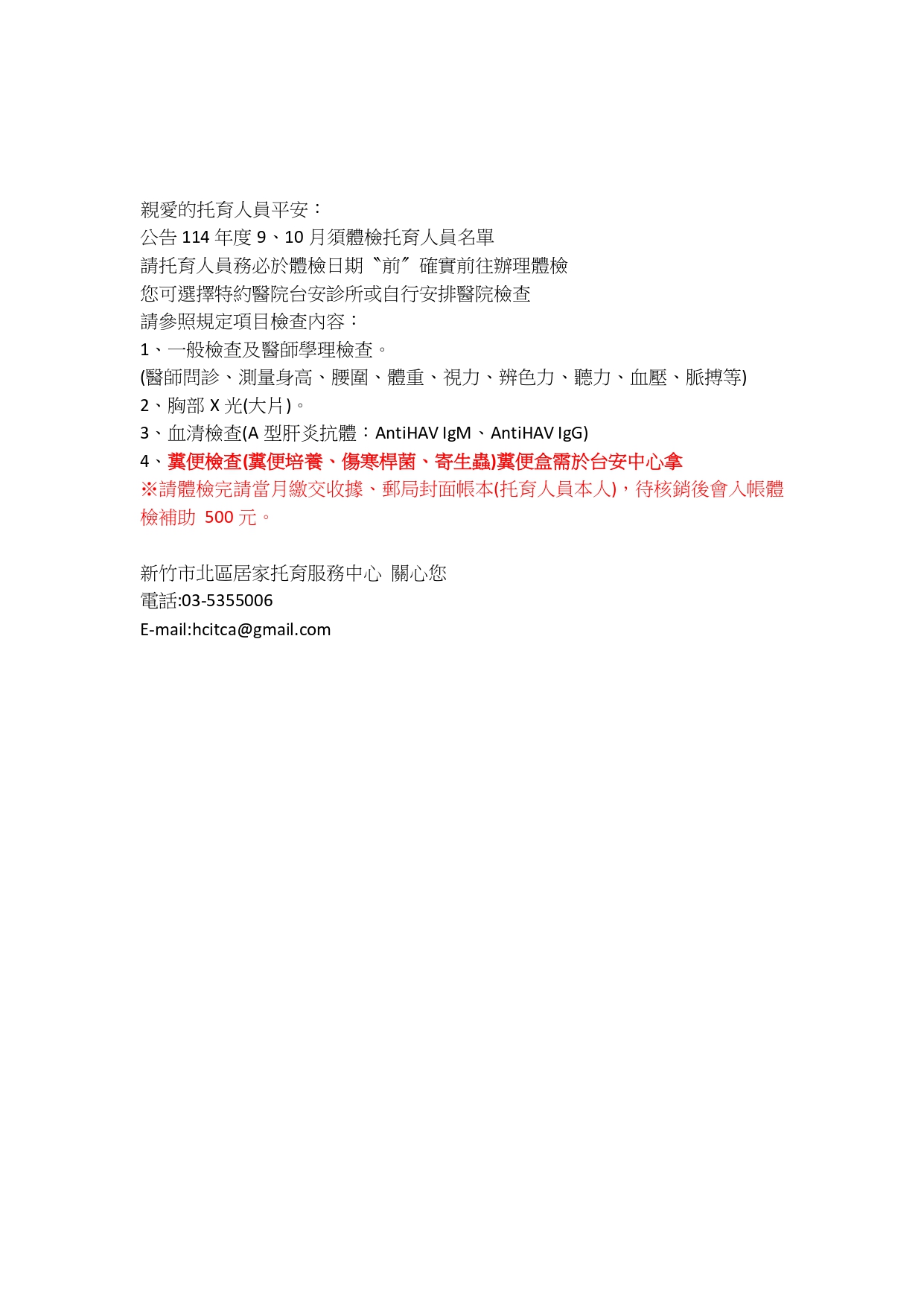 ※請體檢完請當月繳交收據、郵局封面帳本(托育人員本人),待核銷後會入帳體檢補助 500元。
