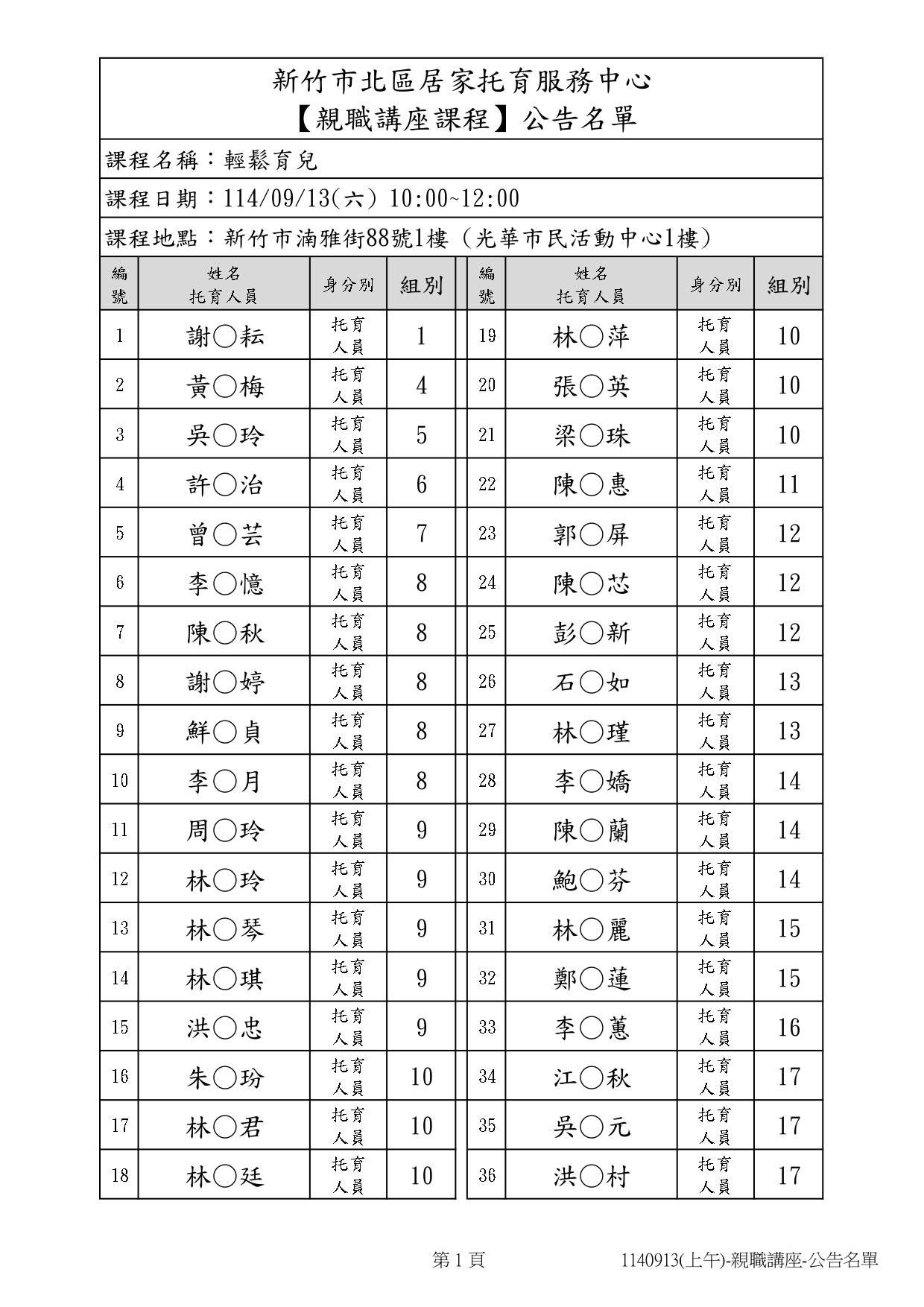 114年09月13日(六)公告課程名單